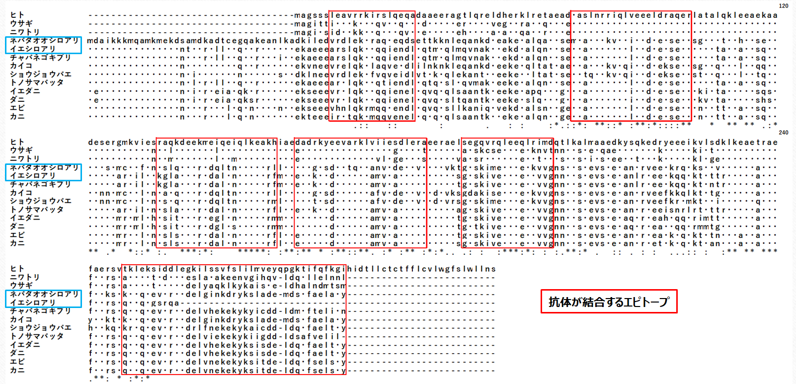 図1に,哺乳類,鳥類,昆虫,ダニ,甲殻類のトロポミオシンのアミノ酸配列を示します。最上列のヒト(哺乳類の代表としてヒトのアミノ酸配列を用いていますが,ヒトを食べるという意味ではありません)と同じアミノ酸は・で表示されています。また,赤枠がエピトープと予測されるアミノ酸部分配列を示しています。上段右側の赤枠内の配列を見ると,哺乳類と鳥類ではアミノ酸が完全に一致していますが,昆虫と甲殻類ではアミノ酸が置換されていて,なおかつ昆虫と甲殻類間でアミノ酸が保存されていることがわかります。エピトープのアミノ酸部分配列が保存されていることが,甲殻類の抗原交差性を裏付けていることを考えると,同様にアミノ酸の部分配列が保存されている甲殻類と昆虫の間でも抗原交差性が示されるものと考えられます。これまでに,ゴキブリとダニに対しては抗原交差性が確認されているので,エピトープの配列が類似しているシロアリも抗原交差性を示すものと予測されます。要約すると,「甲殻類アレルギーの方は,シロアリを食べるとアレルギー症状がおこると予測されるので,シロアリを食べてはいけません」ということになります。